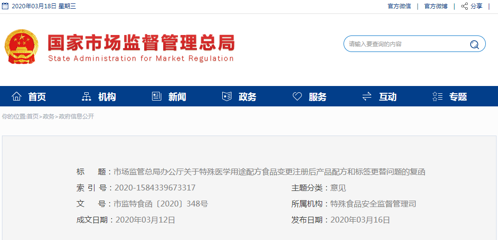 市場(chǎng)監(jiān)管總局辦公廳關(guān)于特殊醫(yī)學(xué)用途配方食品變更注冊(cè)后